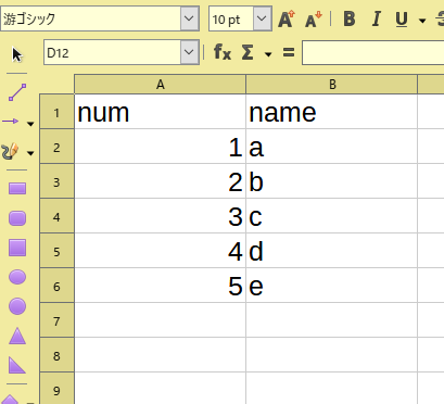 先ず、データのサンプルをA1-B6に配置しました。lp()はCalcの表のデータをやりとりする関数です。headers=Trueでヘッダー部の読み込みをします。