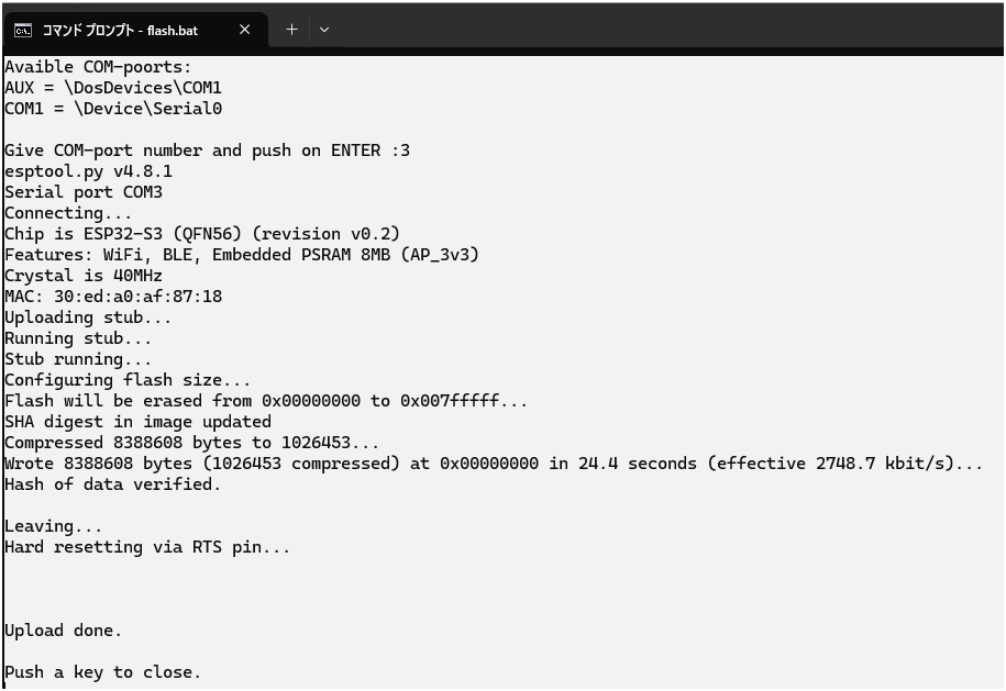 私のファームウエア更新方法。ファームウエアを入手して解凍。フォルダーに移動し、esptool.exeを入手してフォルダーに入れます。flash.batをテキストエディタで以下の内容を入れて作成。flash.batをクリックすると更新が始まります。radioをUSBで接続してCOMの番号を調べてBATの入力欄に番号を入れる必要があります。WindowsのデバイスマネージャーでCOMを確認するとわかります。私の場合はCOM6だったので6を入力しました。ファームウエアの更新はすぐに終了しました。