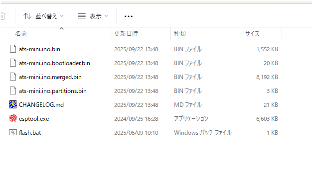 CHANGELOG.md各ファームウェアバージョンの新機能を説明したテキストファイルats-mini.ino.bootloader.binブートローダー(アドレスは0x0)ats-mini.ino.partitions.binパーティションテーブル(アドレスは0x8000)ats-mini.ino.binファームウェア自体(アドレスは0x10000)ats-mini.ino.merged.bin前の 3 つのファイルを 1 つに結合します (アドレスは0x0)